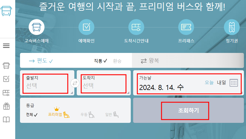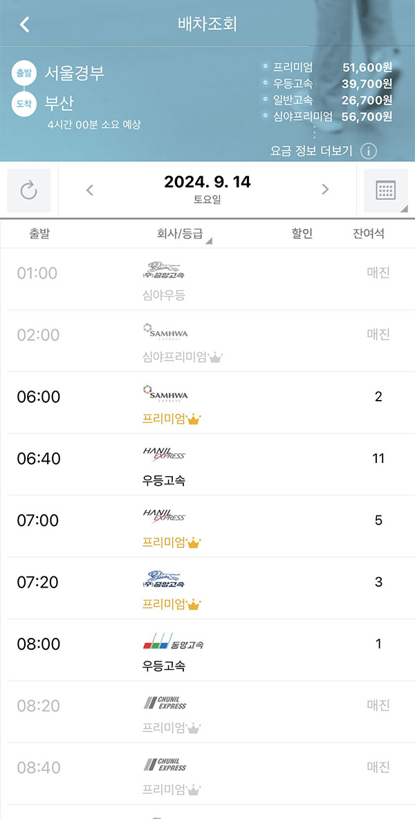 ④ 원하는 등급(프리미엄/우등/일반 등)과 시간대 확인 후 선택