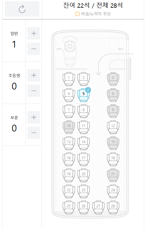 ⑤ 원하는 좌석 및 일반/초등생/보훈 중 선택 후 완료