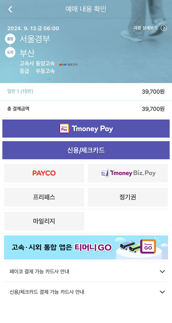고속버스 예매는 모바일 티머니 어플에서도 간편하게 가능합니다.